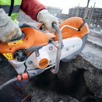 Universeel inzetbare doorslijpmachine met STIHL injectie. Voor doorslijpschijven van 350 mm.