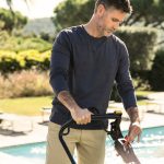 Een bosmaaier van 47,9 cc met fietsstuurhandgreep, anti-vibratie, comfortabel harnas en twee optionele hulpstukken.