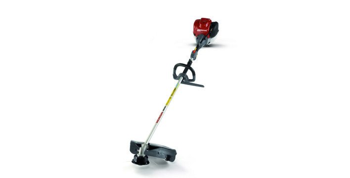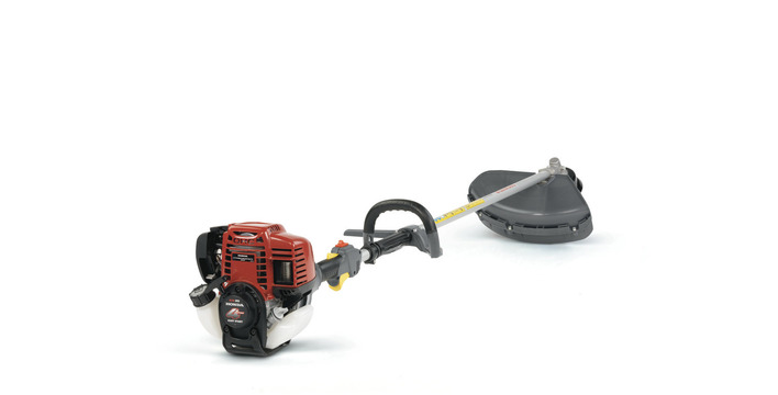 Een bosmaaier van 35 cc met fietsstuurhandgreep, comfortabel harnas en twee optionele hulpstukken.