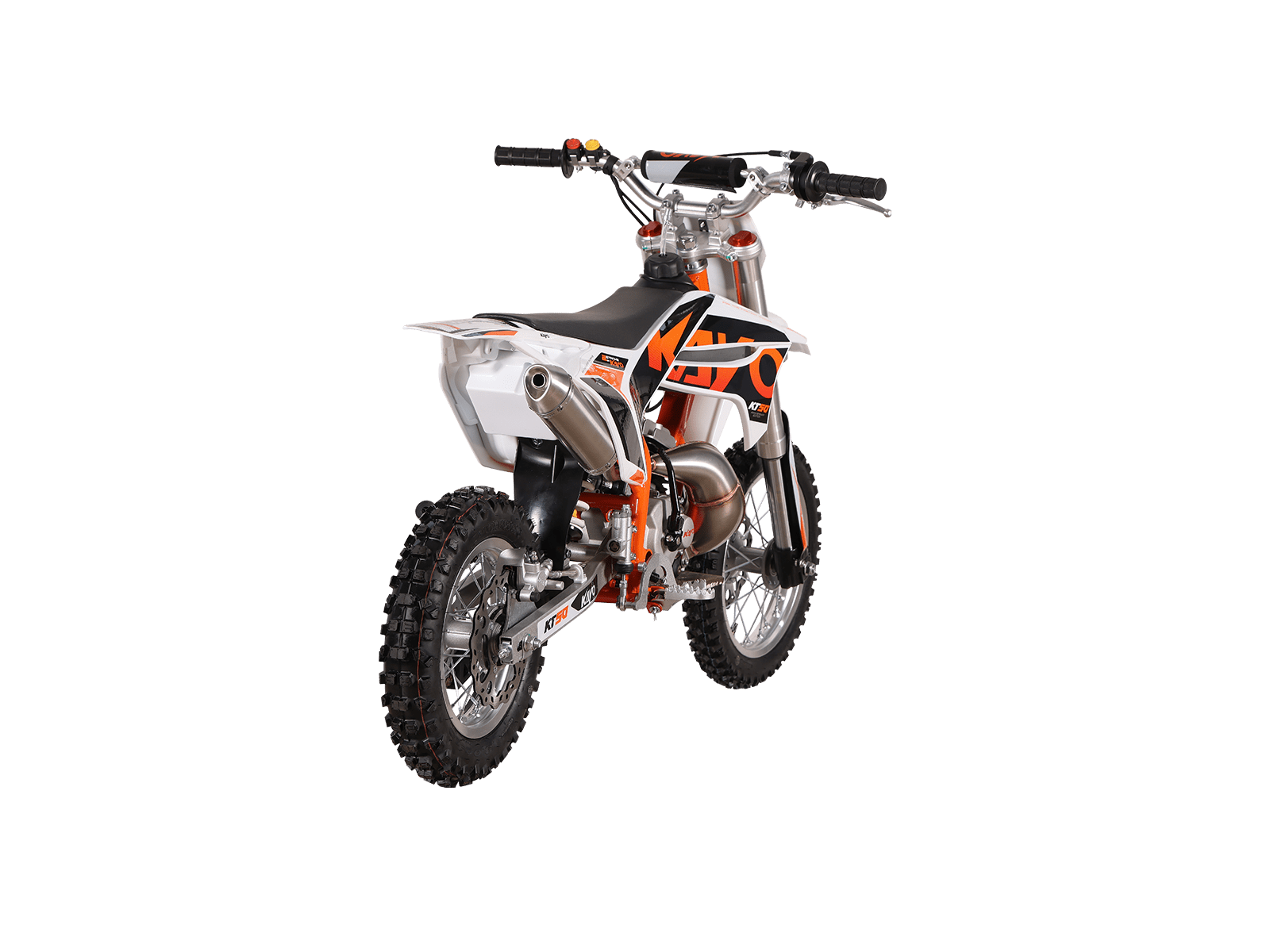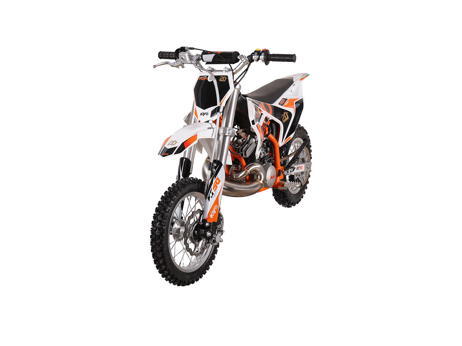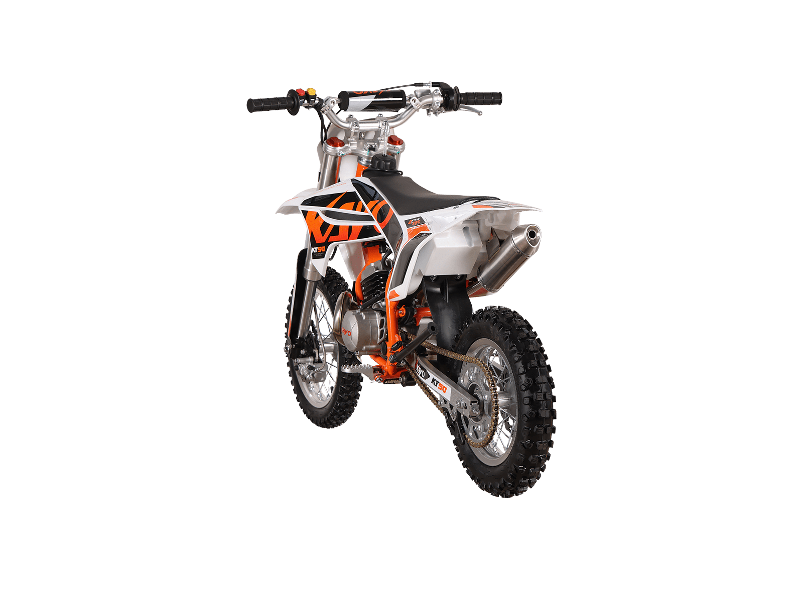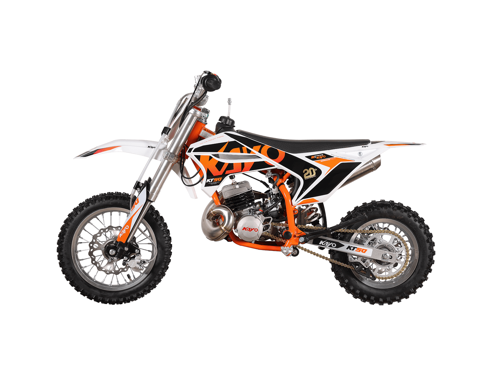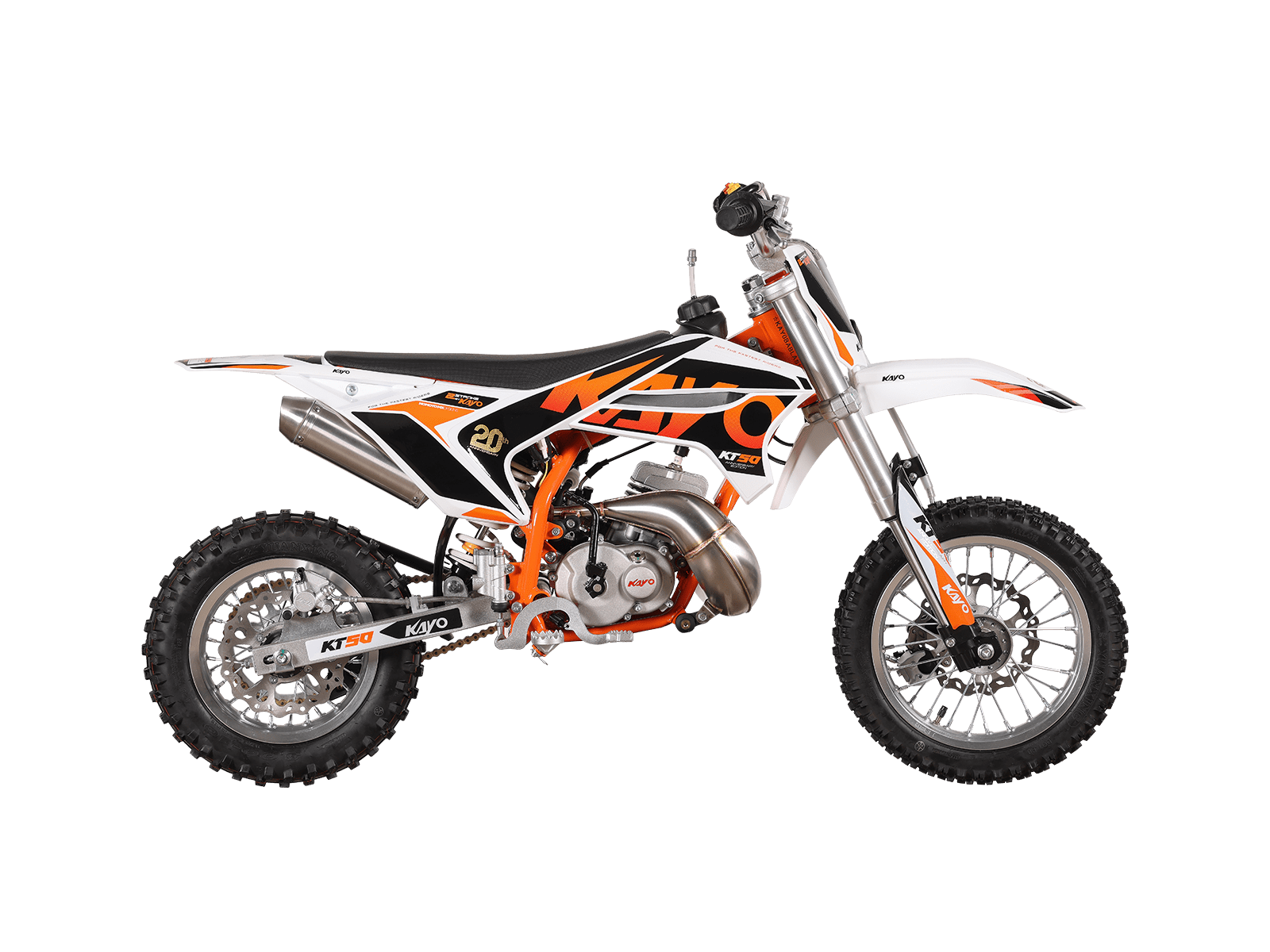 De KAYO KT50 is een lichte, krachtige 50cc dirtbike die perfect is voor zowel beginnende als ervaren rijders. Dankzij de 2-takt luchtgekoelde motor met volautomatische transmissie biedt deze motorfiets een soepele en responsieve rijervaring. Met een robuust kettingaandrijfsysteem, hoogwaardige schijfremmen en een verbeterd uitlaatsysteem, zorgt de KT50 voor maximale prestaties op de crossbaan of ruige off-road paden. De opnieuw ontworpen zuigerstructuur met een verbeterde compressiering minimaliseert slijtage en koolstofophoping, waardoor de motor langer optimaal blijft presteren. Bovendien beschikt de KT50 over een grotere roestvrijstalen uitlaat die dat kenmerkende 2-takt geluid produceert voor een extra kick bij hogere toerentallen. Dankzij de elektrische start en kickstart is starten eenvoudig, terwijl de grote 14” voorband en 12” achterband uitstekende grip en stabiliteit bieden. Het sportieve ontwerp, inclusief de herkenbare KAYO race-styling en graphics, zorgt ervoor dat je niet alleen snel, maar ook stijlvol op de baan staat. Of je nu wilt racen of gewoon plezier wilt maken, de KAYO KT50 is de perfecte keuze voor iedereen die het maximale uit een 50cc dirtbike wil halen.